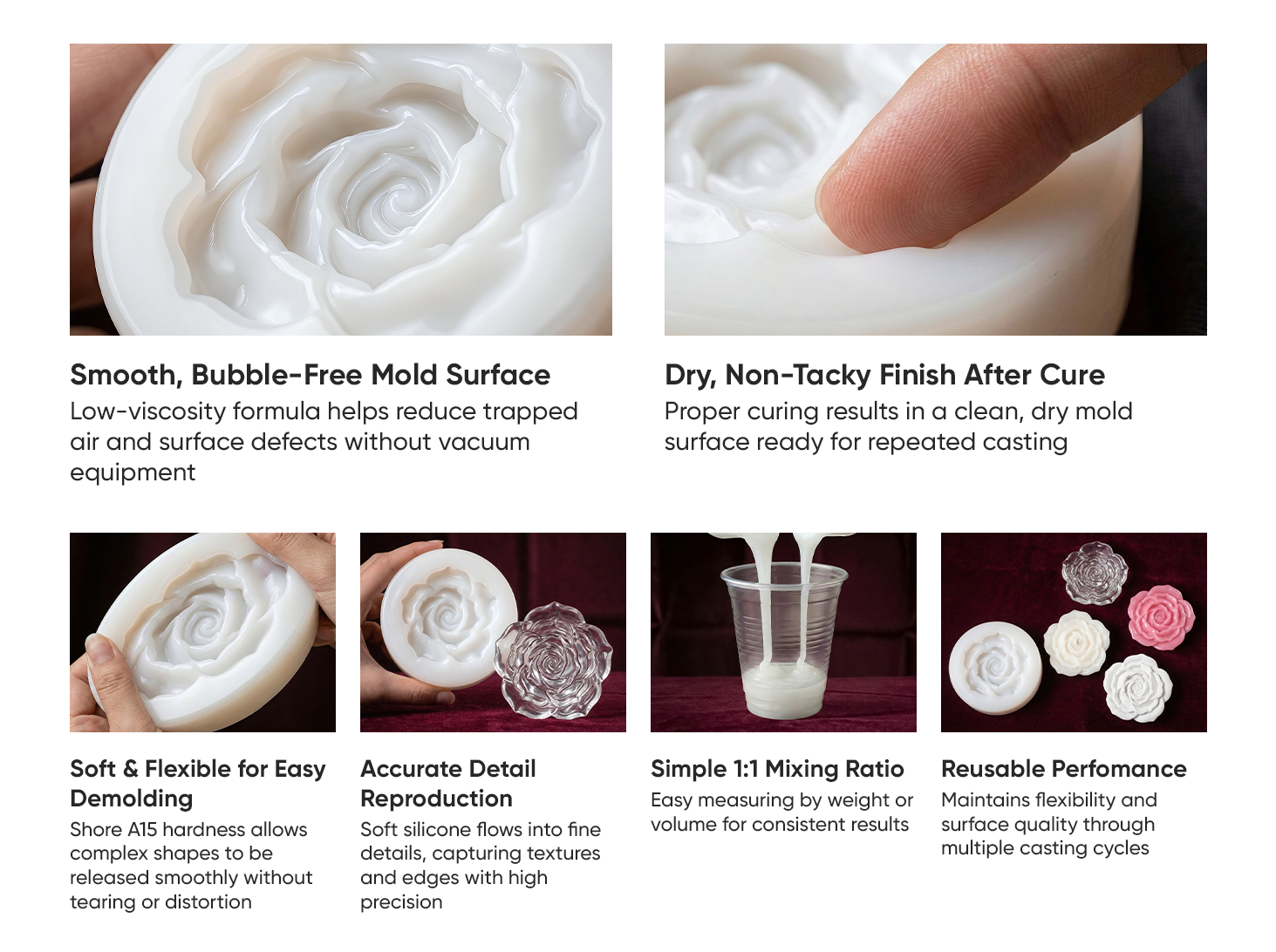 Reduces air bubbles during mixing and pouring. Bubbles naturally rise and release during curing, helping create clean, smooth silicone molds without vacuum degassing.