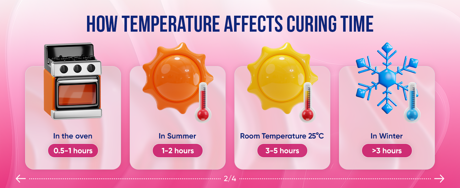 This platinum silicone cures at room temperature in approximately 4 hours, allowing faster mold making and earlier casting. Cure time may vary depending on mold size and thickness.